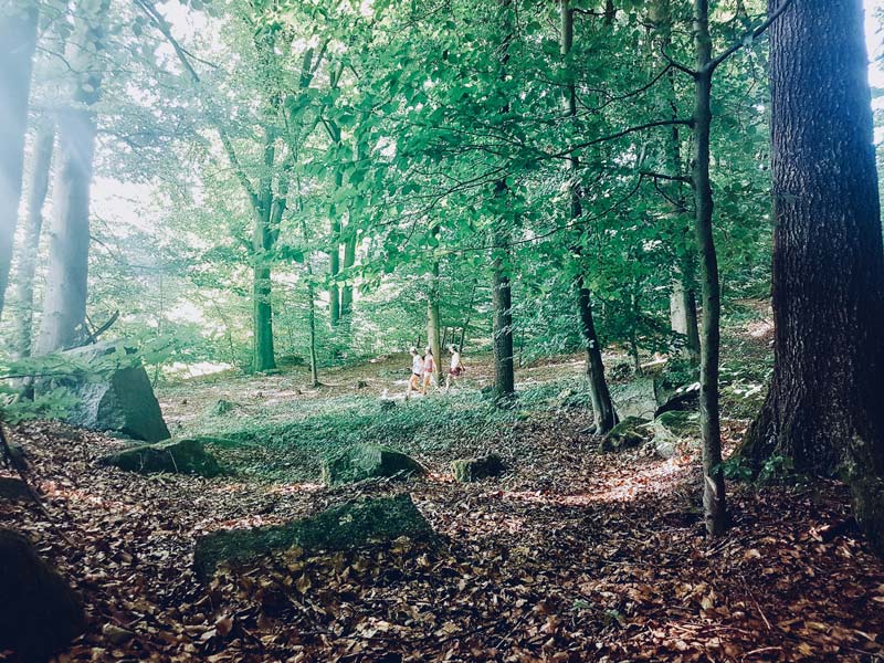 AMY (bei den Steinen): Einige Kinder aus unserer Theatergruppe finden diese Steine gruselig. Die passen hier irgendwie nicht her. Sie sehen aus wie aus einer anderen Zeit. Ich finde aber vielmehr den Wald unheimlich! Wenn ich hier alleine lang laufen würde, würde ich mich schon fürchten ... Schon die Geräusche ... Ich hab dann manchmal Angst, dass eines der unsichtbaren Tiere kommt... (AMY erschrickt sich kurz und schaut nach hinten.) Bleiben Sie mal hier stehen. Ich streife jetzt durch den Streifraum, der jetzt aber unter Ihrer Beobachtung steht.
